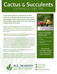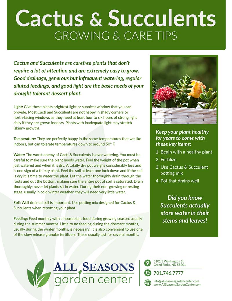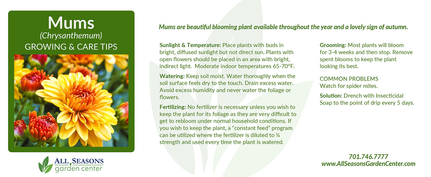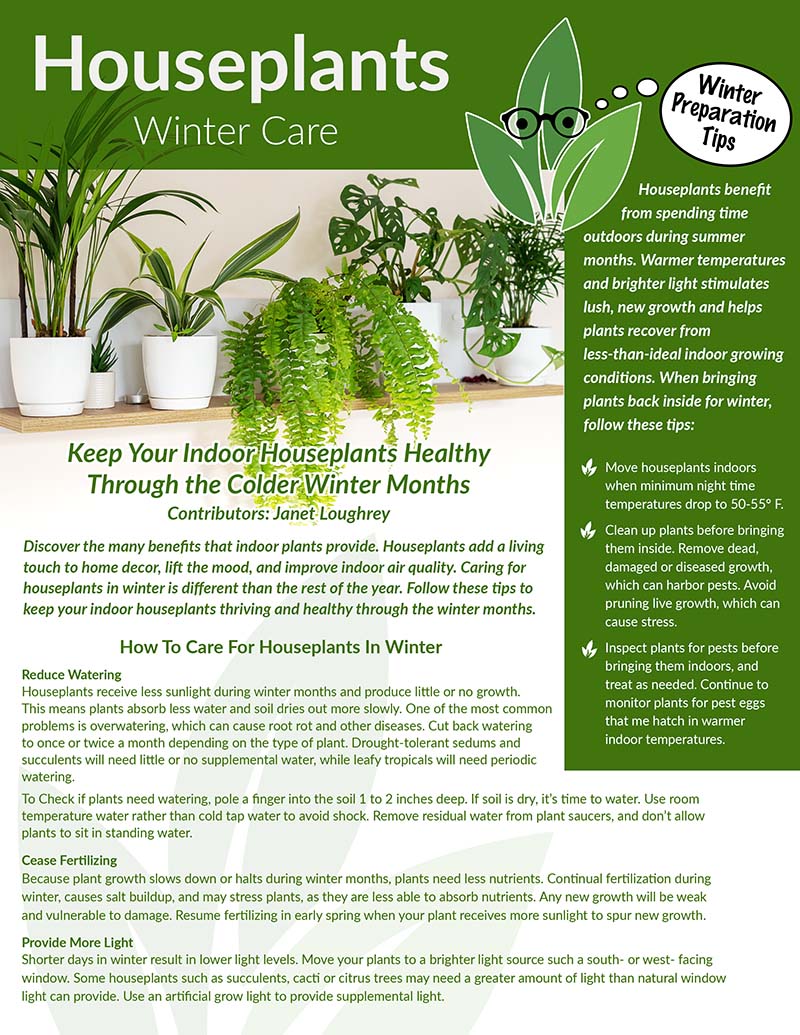 The most common houseplant bugs are aphids, mealybugs, and spider mites. Aphids are green and appear in clusters. Mealybugs are white and appear on the undersides of leaves and crevices on the plant. Spider mites are most often noticed due to the webbing that appears on the plant. Insects may be controlled by washing the plant with a mild soap and warm water every few days. If they persist, you may need to use a pesticide or a miticide, depending on the bug. All Seasons carries these products year round and we have systemic insecticides that may be added to the soil to prevent and stop any further bug infestations. Always read the label before applying any chemicals. Bugs may be prevented by cleaning your plants regularly, planting them in well-draining containers and offering good air flow and ventilation.