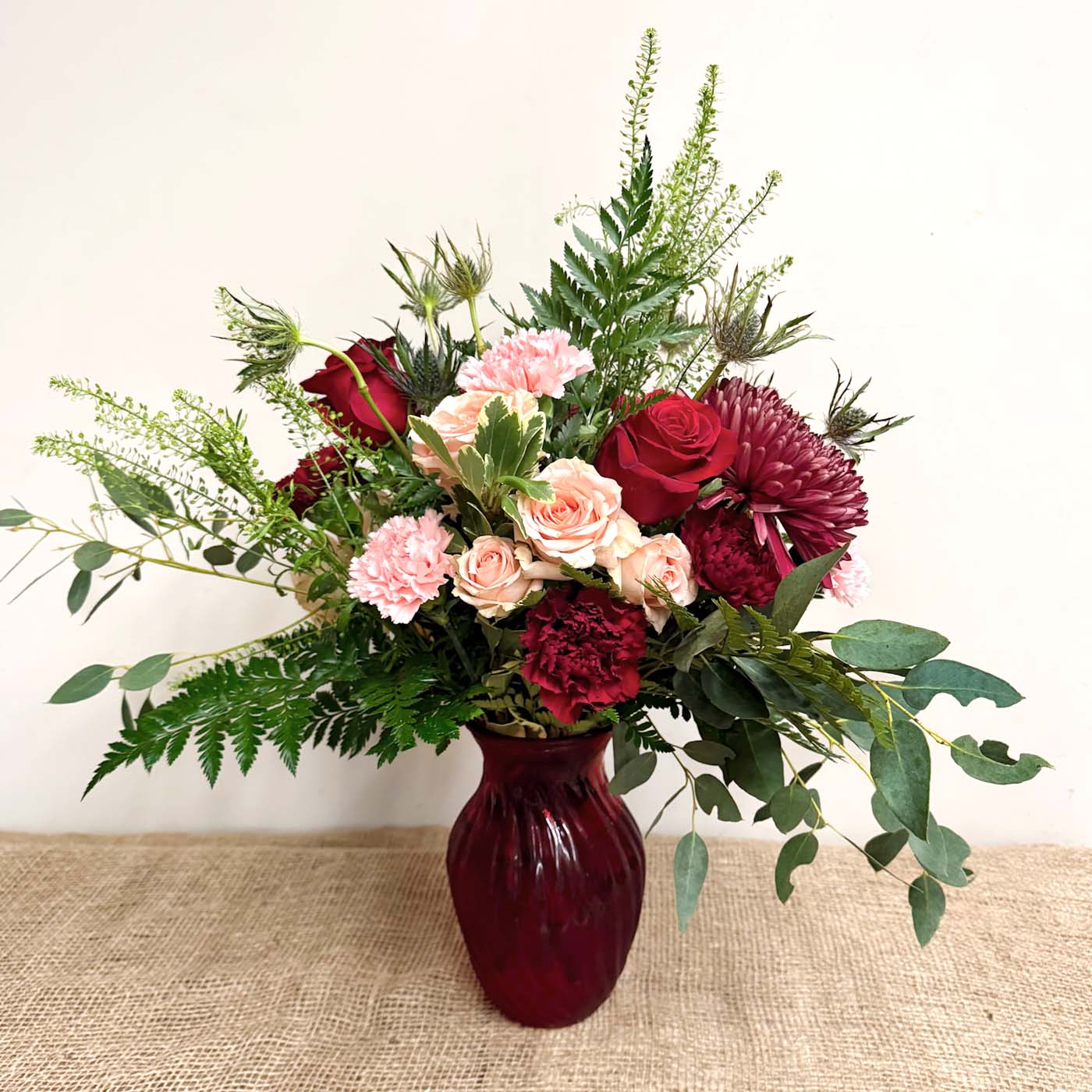 Rosy hues, ruby tones, and deep plum blooms surrounded in greenery.