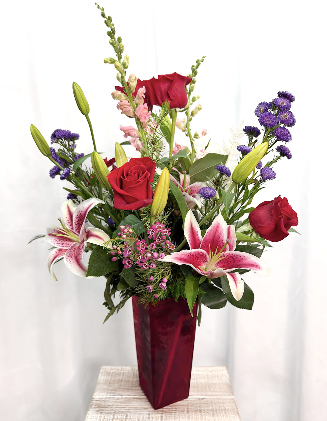 A breathtaking creation of roses, paired with striking lilies and textured snapdragons capturing timeless love.